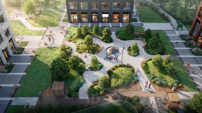 Концепция благоустройства создана в соавторстве с именитым бюро GAFA. На площади 0,35 га расположатся зоны для отдыха, занятий спортом и прогулок. Во дворе для жителей жилого комплекса будет создан коворкинг прямо на свежем воздухе - открытые беседки и Wi-Fi на территории. Атмосферу приватности подчеркнёт обилие растительности - деревья и кустарники займут 50% двора. За счёт большого количества хвойных насаждений территория жилого комплекса будет зелёной круглый год.