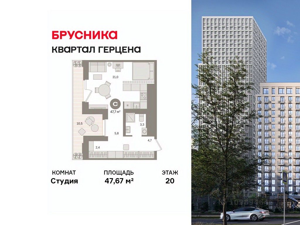 Студия в Квартале Герцена. Особенности планировки: гардеробная, ипотека от 2,98% на 1 год, предчистовая отделка, терраса.