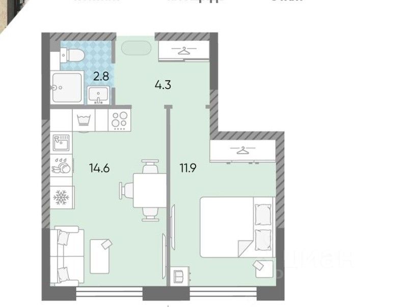 Общая площадь квартиры составляет 33.5 кв. м, с просторной кухней 15 кв. м и жилой площадью 12 кв. м. Высота потолков — 2.8 метра, что придает помещению дополнительный объем и свет. Квартира с чистовой отделкой и мебелью от застройщика, поэтому все готово к вашему переезду.