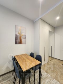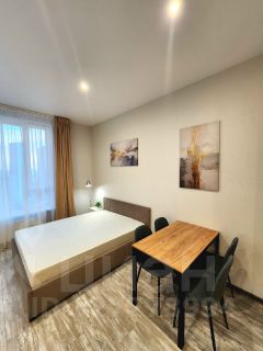Квартира расположена на 28 этаже (этажность дома — 34 этажа), что обеспечивает отличный вид из окна и тишину. В студии выполнен качественный дизайнерский ремонт в теплых тонах.
