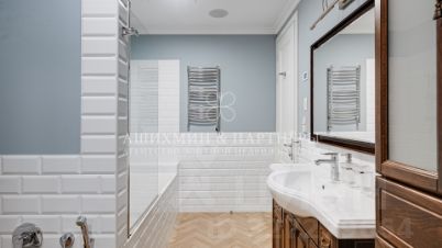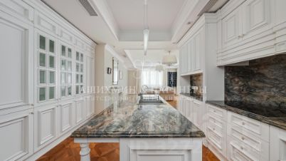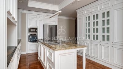 В отделке использованы высококачественные натуральные материалы. Кухня производства фабрики EPOCART (Италия), бытовая кухонная техника фирмы NEFF, AEG, Miele, установлена охранная система Цезарь Сателлит.