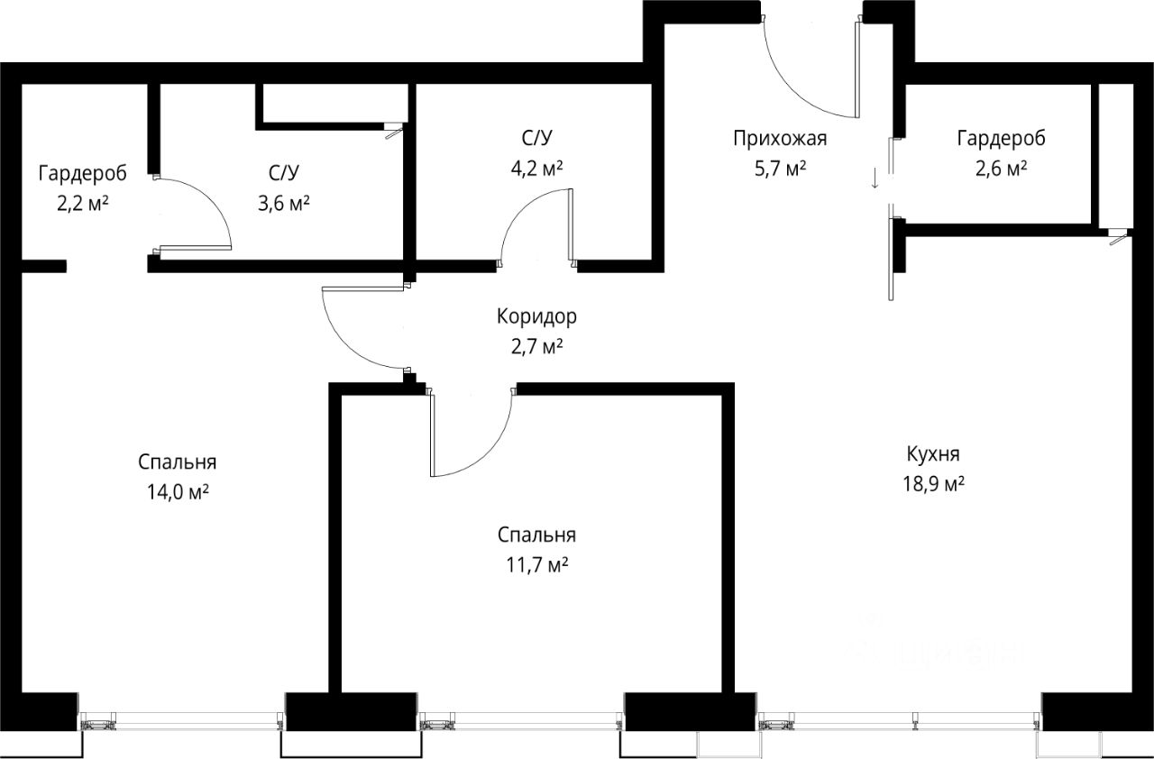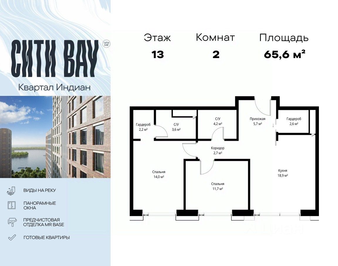 Продаётся 2-комнатная квартира общей площадью 65.60 м² с предчистовой отделкой в ЖК Сити Бэй на 13-м этаже 20 этажного дома.
