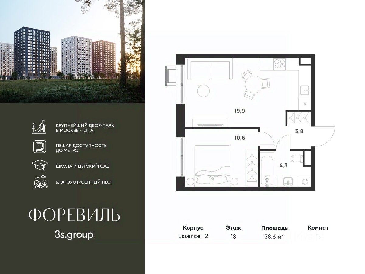 Предчистовая отделка в подарок! Пешая доступность от метро и московская прописка! Продается уютная 1-комн. квартира площадью 38,6 кв.м на 13 этаже 17 этажного жилого комплекса бизнес-класса Foreville от 3S Group.