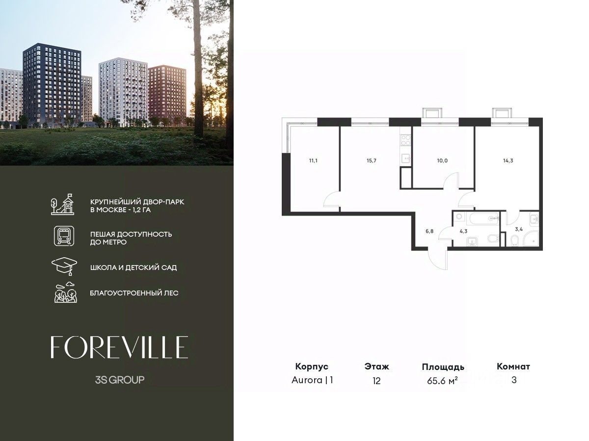 Продается уютная 3-комн. квартира площадью 65,6 кв.м на 12 этаже 17 этажного жилого комплекса бизнес-класса Foreville от 3S Group.