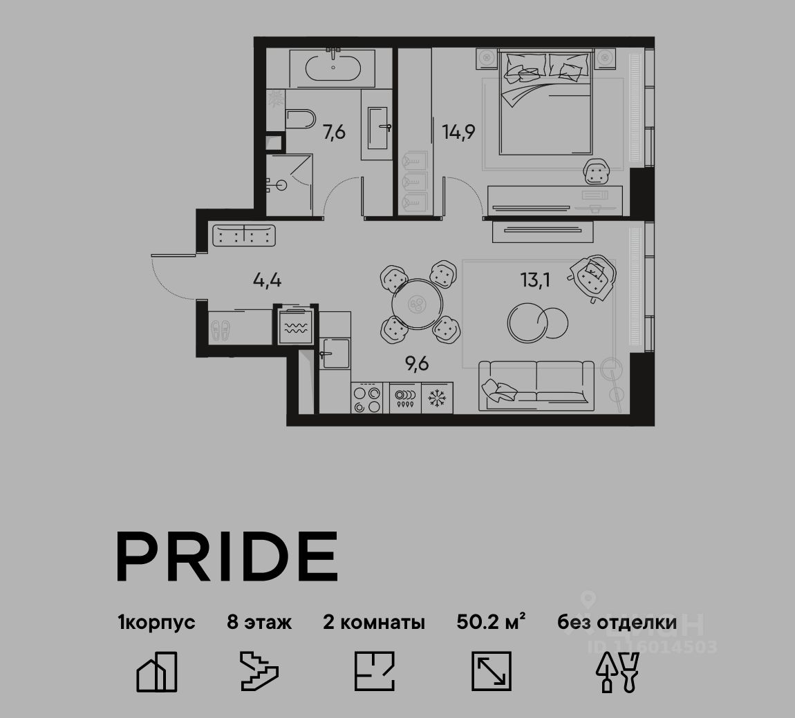 В премиальном жилом квартале Прайд продается 2-комнатная квартира в 1 корпусе, на 8 этаже, в секции 3. Её общая площадь составляет 50.2 м². Пространство включает 1 уютную спальню 14,9 м², просторную кухню-гостиную 22,7 м² и ванную комнату 7,6 м². Ключи в 2026 году.