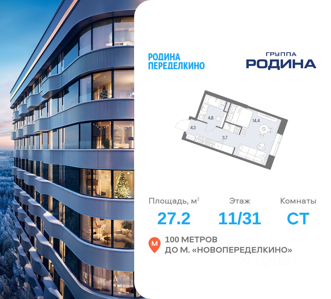 Продаётся студия площадью 27.2 м² на 11 этаже в Жилом Комплексе "Родина Переделкино".