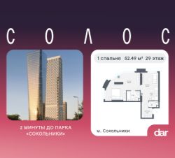 Продаётся 1-комнатная квартира 52.49 м² в жилом комплексе Солос (бизнес-класс) рядом с парком Сокольники. Квартиру отличают панорамное остекление, потолки 3.2 м, улучшенная шумо и воздухоизоляция. Дом сдаётся в 4 квартале 2029 года, продажи проходят через эскроусчета. Подземный паркинг, коворкинг, закрытая благоустроенная территория с фонтаном и артобъектами. Гибкие условия покупки.