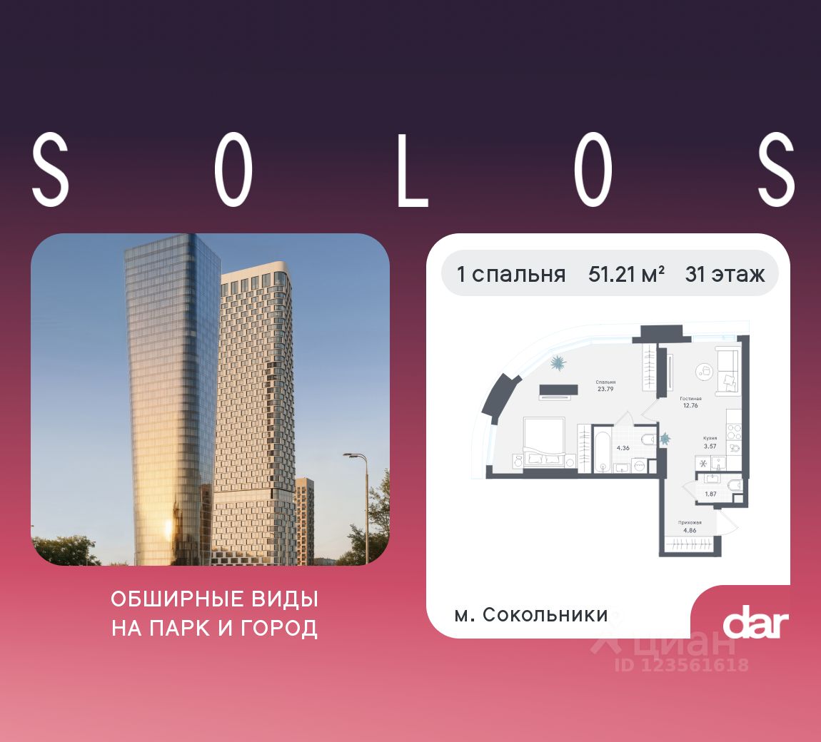 Продаётся 1-комнатная квартира 51.21 м² в жилом комплексе SOLOS (бизнес-класс) рядом с парком Сокольники. Квартиру отличают панорамное остекление, потолки 3.2 м, улучшенная шумо и воздухоизоляция. Дом сдаётся в 4 квартале 2029 года, продажи проходят через эскроусчета. Подземный паркинг, коворкинг, закрытая благоустроенная территория с фонтаном и артобъектами. Гибкие условия покупки.