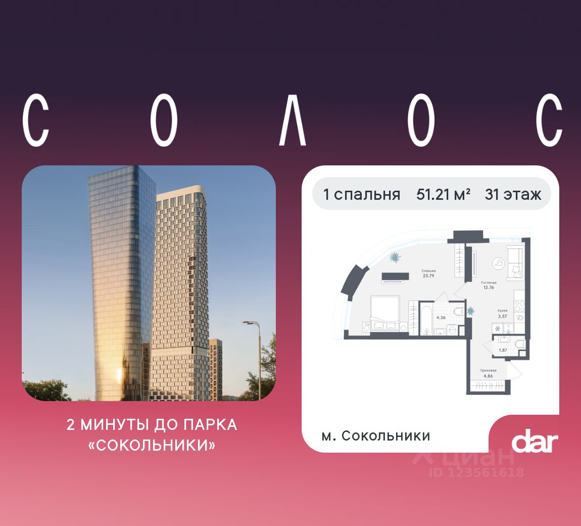 Продаётся 1-комнатная квартира 51.21 м² в жилом комплексе Солос (бизнес-класс) рядом с парком Сокольники. Квартиру отличают панорамное остекление, потолки 3.2 м, улучшенная шумо и воздухоизоляция. Дом сдаётся в 4 квартале 2029 года, продажи проходят через эскроусчета. Подземный паркинг, коворкинг, закрытая благоустроенная территория с фонтаном и артобъектами. Гибкие условия покупки.