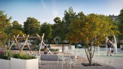 Закрытый двор с благоустройством в созерцательном стиле: фонтан, артобъекты, зоны тихого отдыха, детские и спортивные площадки.