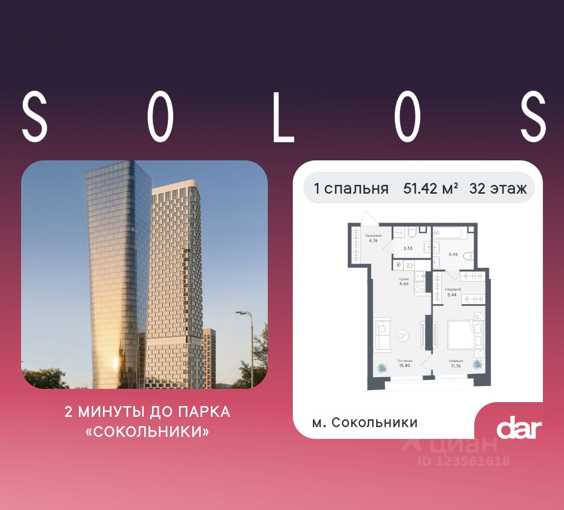 Продаётся 1-комнатная квартира 51.42 м² в жилом комплексе SOLOS (бизнес-класс) рядом с парком Сокольники. Квартиру отличают панорамное остекление, потолки 3.2 м, улучшенная шумо и воздухоизоляция. Дом сдаётся в 4 квартале 2029 года, продажи проходят через эскроусчета. Подземный паркинг, коворкинг, закрытая благоустроенная территория с фонтаном и артобъектами. Гибкие условия покупки.