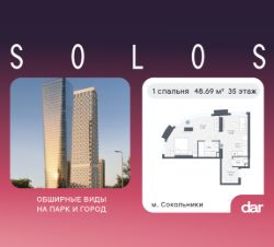 Продаётся 1-комнатная квартира 48.69 м² в жилом комплексе SOLOS (бизнес-класс) рядом с парком Сокольники. Квартиру отличают панорамное остекление, потолки 3.2 м, улучшенная шумо и воздухоизоляция. Дом сдаётся в 4 квартале 2029 года, продажи проходят через эскроусчета. Подземный паркинг, коворкинг, закрытая благоустроенная территория с фонтаном и артобъектами. Гибкие условия покупки.