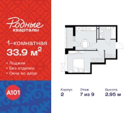 Продается однокомнатная квартира 318 в новостройке Жилой район "Родные кварталы" по адресу Москва, ТиНАО, Новомосковский АО, Марушкинское С/П, жилой комплекс Родные Кварталы, 2, район Внуково, Новомосковский административный округ, Москва. Общая площадь квартиры - 33.90 кв. м., этаж 7 из 9, секция 7. Тип проекта, по которому построен дом - монолит, компания-застройщик - ООО "А101". Стоимость квартиры - 10456455 Р. Срок сдачи - 2 квартал 2026.