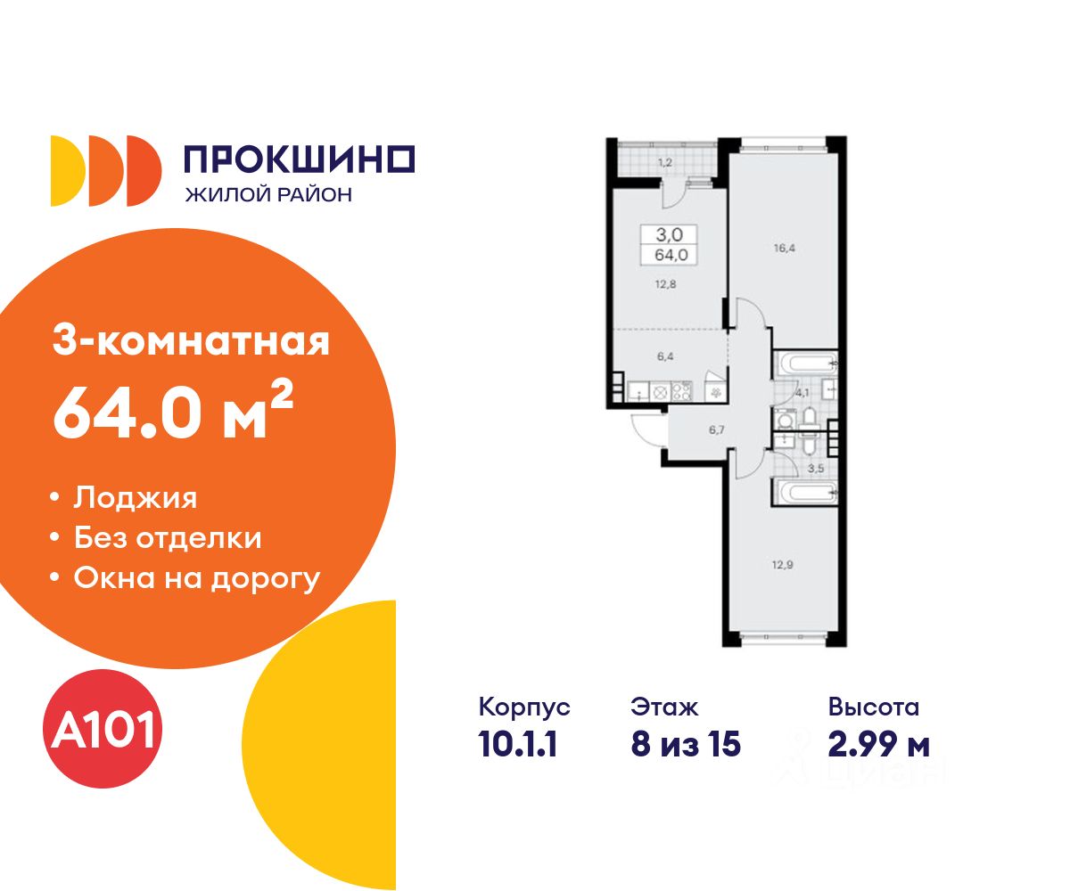 Продается трехкомнатная квартира 123 в новостройке Жилой квартал "Прокшино" по адресу Москва, ТиНАО, Новомосковский АО, Сосенское С/П, жилой комплекс Прокшино, к10.1.1, район Коммунарка, Новомосковский административный округ, Москва. Общая площадь квартиры - 64.00 кв. м., этаж 8 из 15, секция 2. Тип проекта, по которому построен дом - монолит, компания-застройщик - ООО "А101". Стоимость квартиры - 26465280 Р.