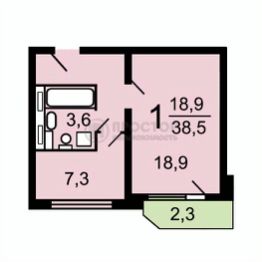 общая площадь квартиры составляет 38,5 кв. м, из которых 18,9 кв. м — жилая площадь.