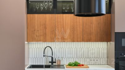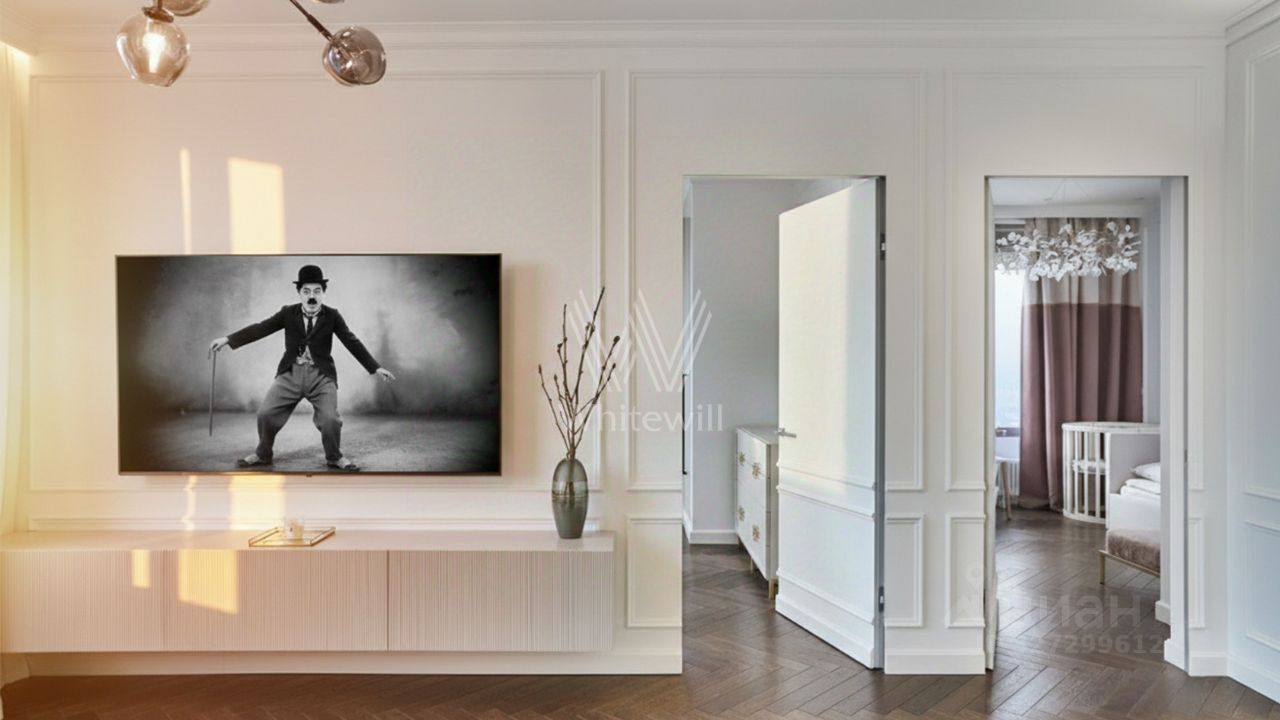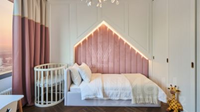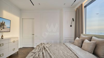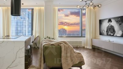 Квартира с отделкой расположена на 50 этаже корпуса Tandem. Интерьер оформлен в стиле современном классики, преимущественно в светлых тонах.
