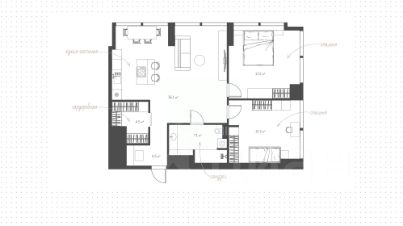 Функциональная планировка включает просторную кухню-гостиную с обеденной и ТВ зонами, 2 спальни, санузел, вместительную гардеробную и прихожую.
