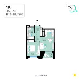 В продаже — однокомнатная квартира, общей площадью 45,34 кв. м. Квартира расположена на третьем этаже десятиэтажного корпуса Балансд в квартале В16 нового района СберСити, который строит Сбер.