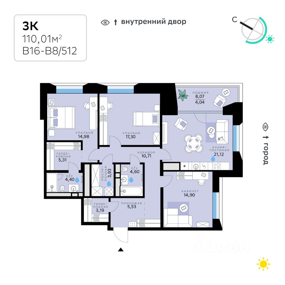 В продаже — трехкомнатная квартира, общей площадью 110,01 кв. м. Квартира расположена на седьмом этаже десятиэтажного корпуса Балансд в квартале В16 нового района СберСити, который строит Сбер.