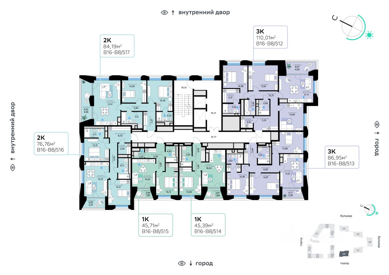 Квартал состоит из девяти домов средней этажности — от 7 до 10 этажей. Корпуса формируют большой внутренний двор площадью два гектара. Во дворе предусмотрены зоны для разных сценариев: просторные площадки для детей, пространства для активного досуга и спорта, тихие места для отдыха и спокойного времени, а также удобные рабочие места под открытым небом. Здесь легко найти своё — для жизни, здоровья и занятий тем, что действительно нравится.