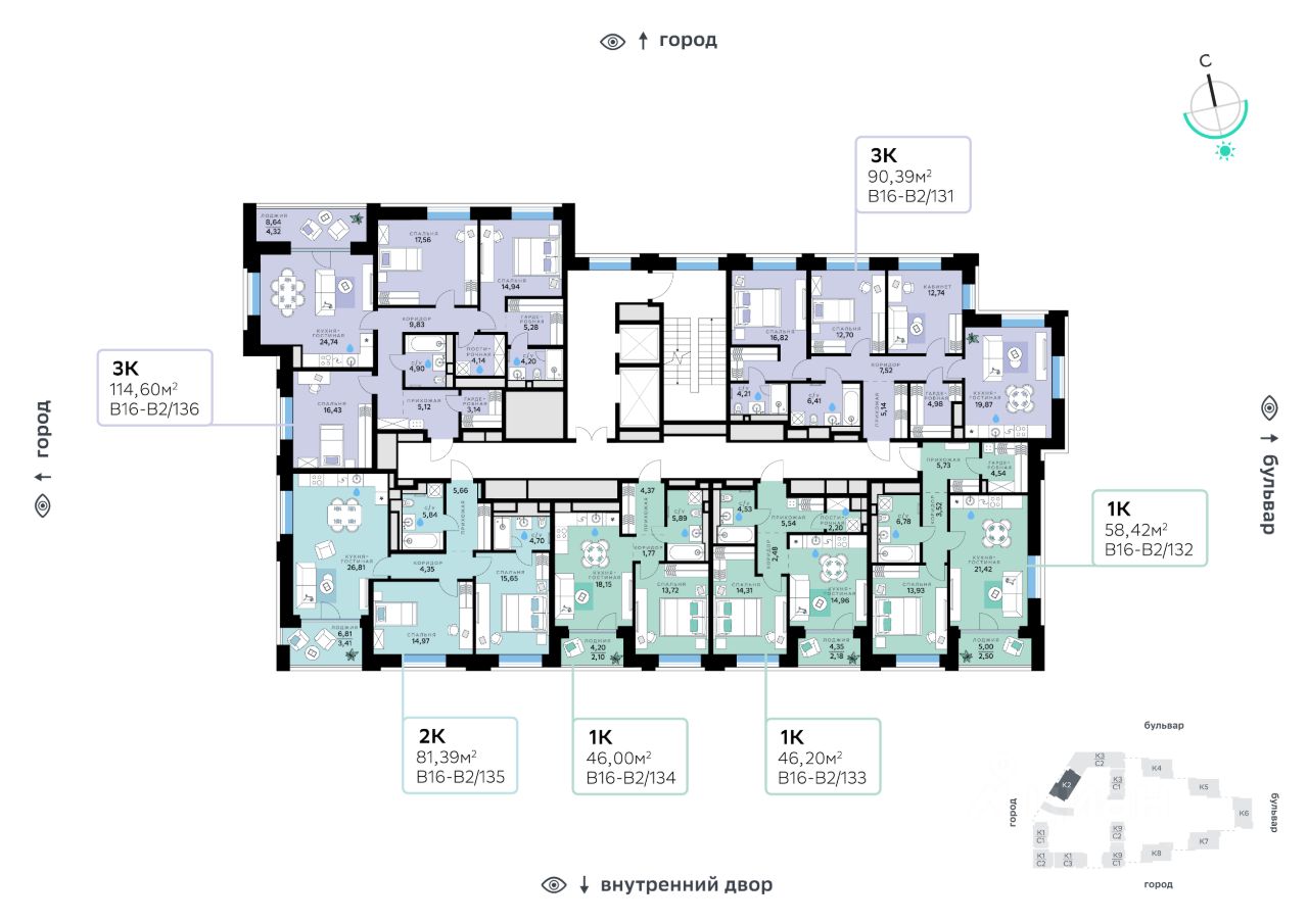 Квартал состоит из девяти домов средней этажности — от 7 до 10 этажей. Корпуса формируют большой внутренний двор площадью два гектара. Во дворе предусмотрены зоны для разных сценариев: просторные площадки для детей, пространства для активного досуга и спорта, тихие места для отдыха и спокойного времени, а также удобные рабочие места под открытым небом. Здесь легко найти своё — для жизни, здоровья и занятий тем, что действительно нравится.