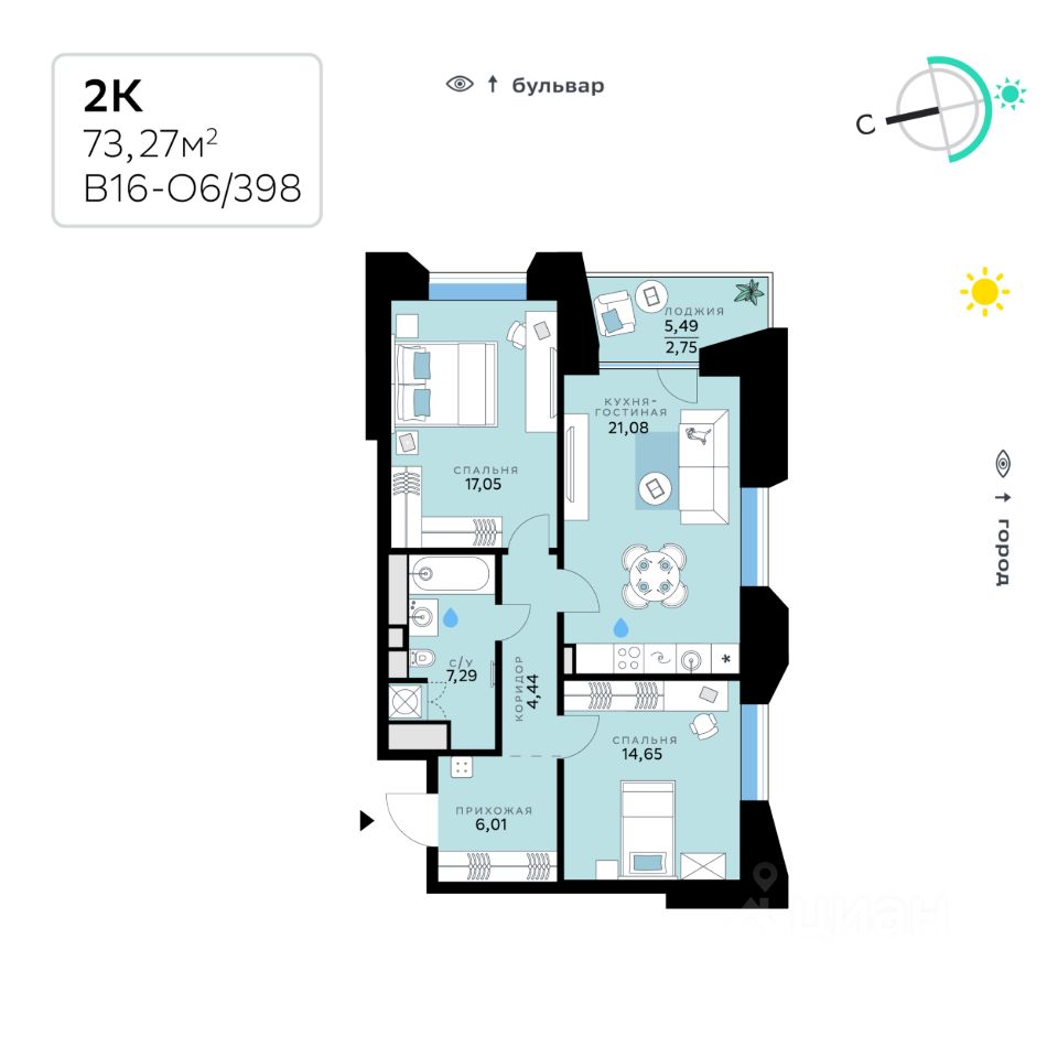 В продаже — двухкомнатная квартира с чистовой отделкой, общей площадью 73,27 кв. м. Квартира расположена на четвертом этаже восьмиэтажного корпуса Оптимум в квартале В16 нового района СберСити, который строит Сбер.