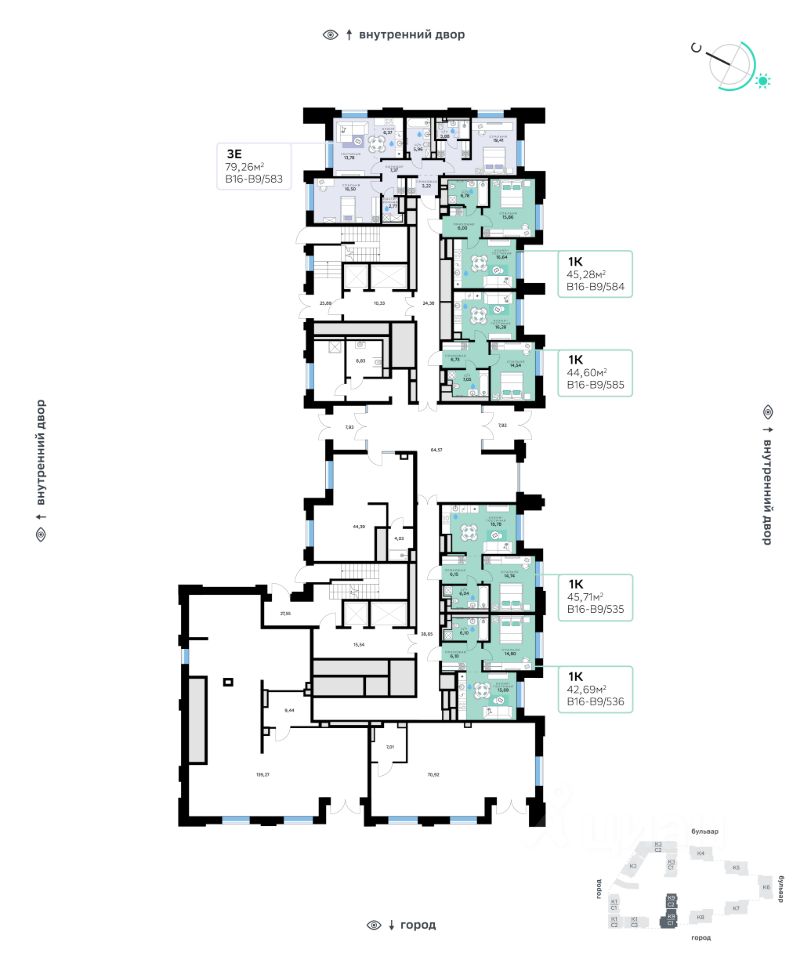 Квартал состоит из девяти домов средней этажности — от 7 до 10 этажей. Корпуса формируют большой внутренний двор площадью два гектара. Во дворе предусмотрены зоны для разных сценариев: просторные площадки для детей, пространства для активного досуга и спорта, тихие места для отдыха и спокойного времени, а также удобные рабочие места под открытым небом. Здесь легко найти своё — для жизни, здоровья и занятий тем, что действительно нравится.