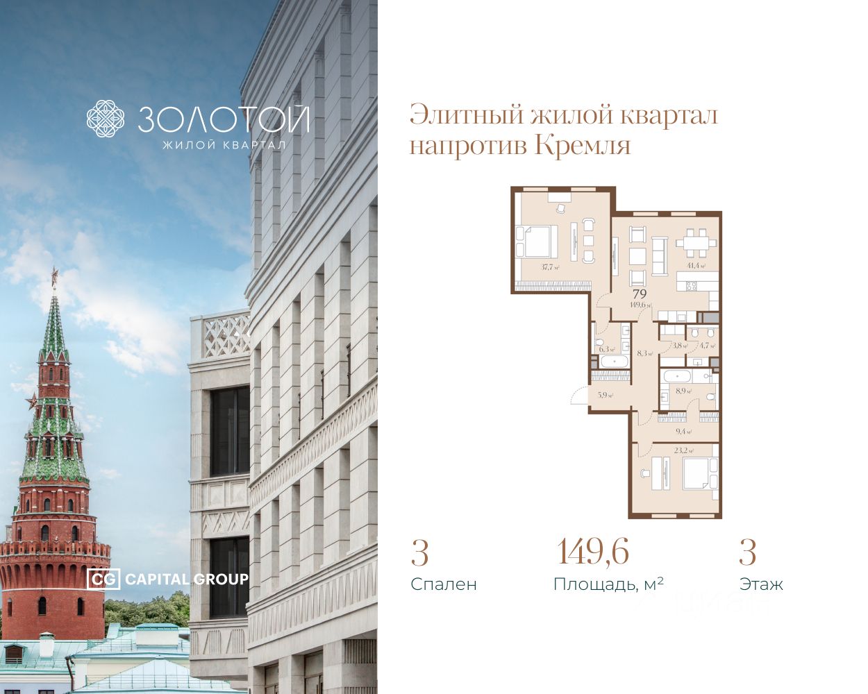 Светлая 3-комнатная квартира площадью 149,6 кв. м, расположенная на 3 этаже в новом жилом квартале "Золотой-2" от Capital Group - прямо напротив Кремля. Окна шикарной кухни-гостиной площадью 41,4 кв. м, являющейся идеальным местом для воплощения буквально любых дизайнерских идей, выходят в сторону Москва-реки и Кремля, делая все пространство квартиры невероятно светлым. Две просторные спальни площадью 37,7 и 32,6 кв.м объединены с собственными ванными комнатами, окна одной master-beedroom выходят на Кремль, второй на тихий и уютный двор проекта. Квартира предлагается к продаже без отделки.