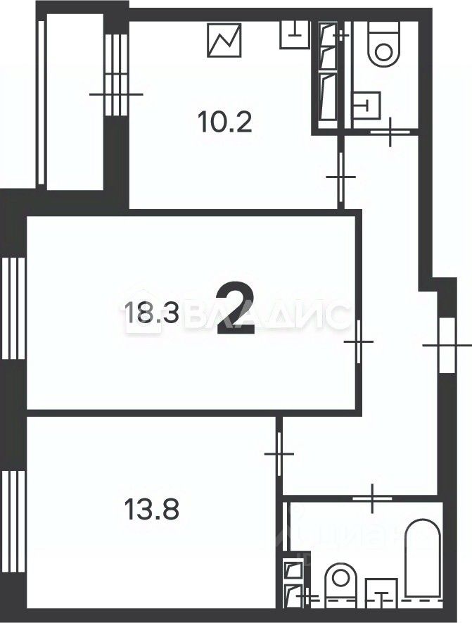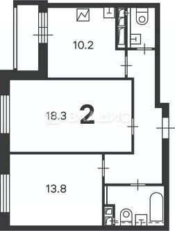 Квартира общей площадью 57,6 кв. м расположена на втором этаже 21-этажного монолитного дома, 2025 года. Высота потолков — 2,7 м. Жилая площадь — 32 кв. м, площадь кухни — 10,2 кв. м. Площадь комнат: 18,3 кв. м и 13,7 кв. м. В квартире один совмещённый санузел и одна лоджия.