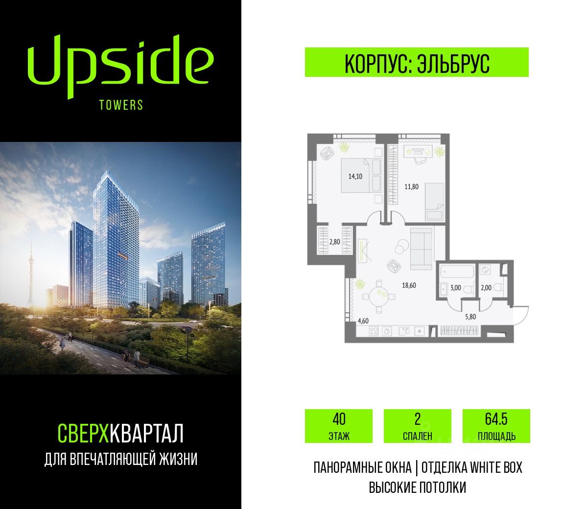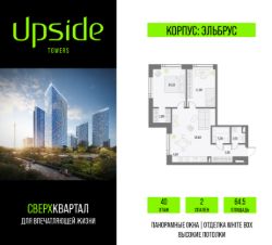 Апсайд Тауэрс - технологичный квартал строится в динамично развивающемся Бутырском районе, в 3 мин. от метро, в 5 мин. от ТТК. На территории 7 га возводится 5 высотных башен от 19 до 58 этажей, названных в честь главных вершин земли. Квартиры с панорамными окнами в пол, высокими потолками и современными инженерными решениями. Благоустроенная зеленая территория включает: приватные дворы, природный комплекс, прогулочный бульвар, ландшафтный парк 2,5 га с сенсорным садом и многофункциональными игровыми и спортивными площадками.