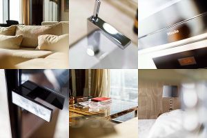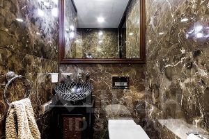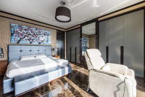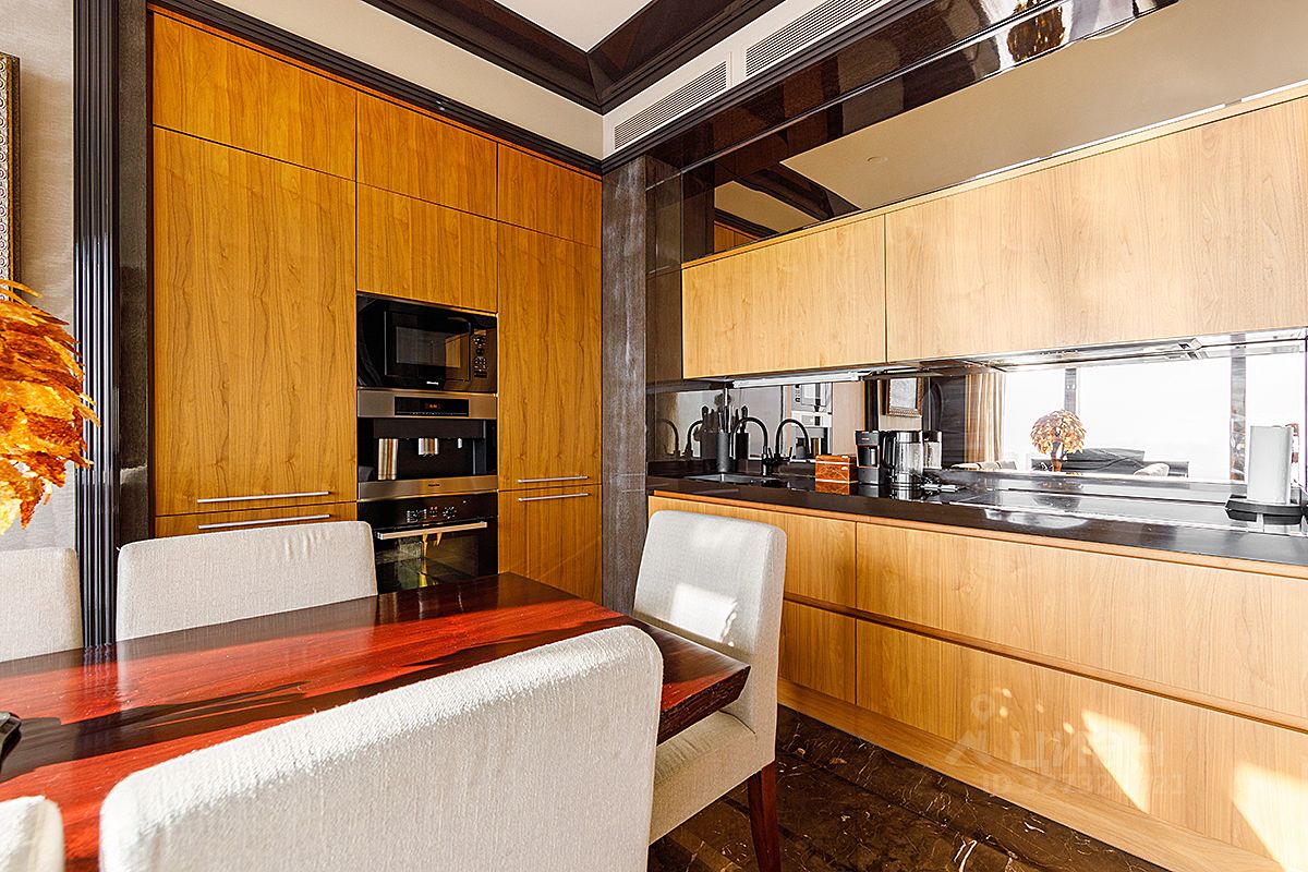 В отделке использованы только премиальные материалы — натуральный камень, массив дерева, мягкий текстиль на стенах. Встроенная техника премиум-класса, потолки 3,5 метра, качественная мебель в жилых комнатах и на кухне, панорамные виды на Москва-реку и центр города.