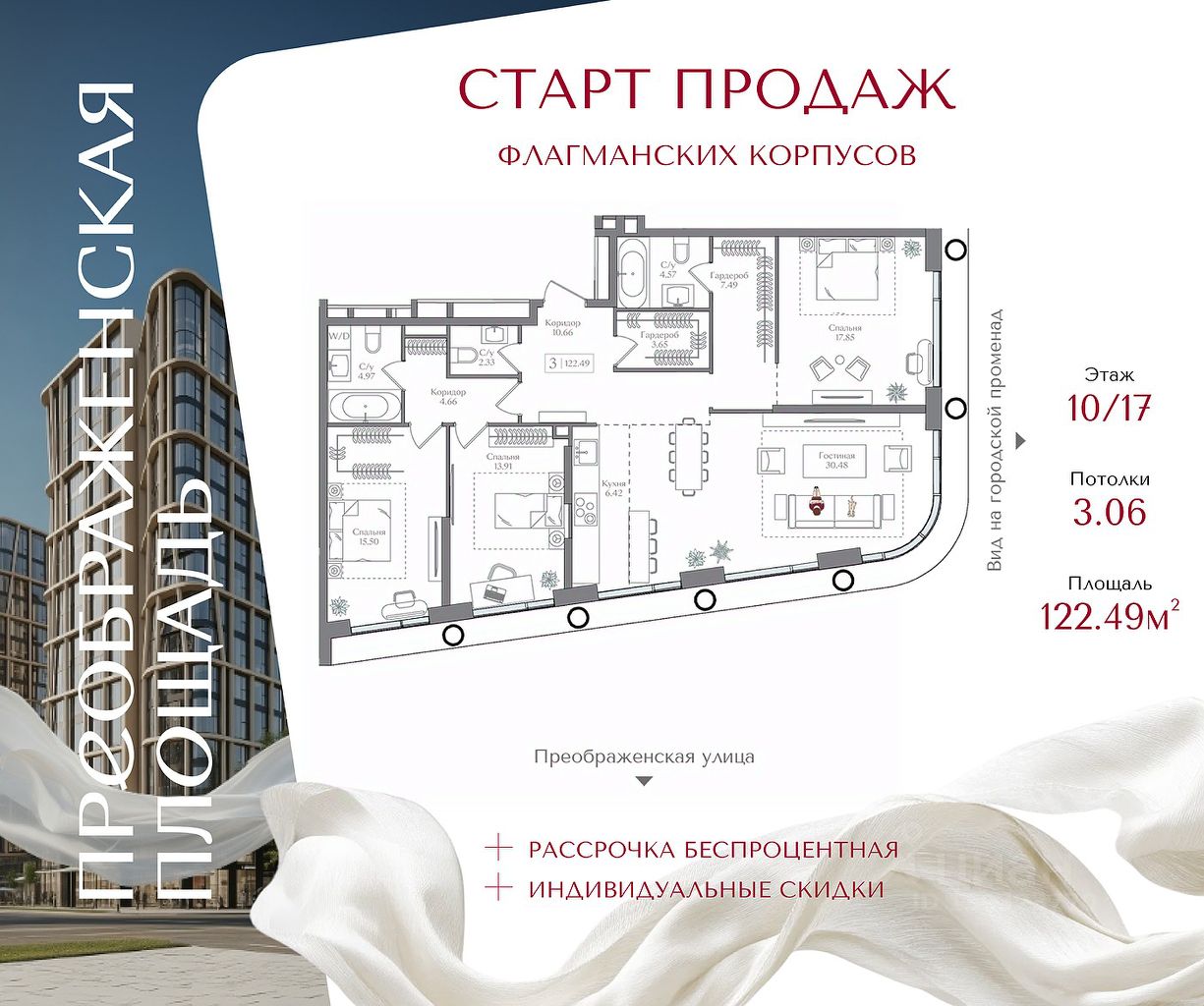 Жилой комплекс "Преображенская площадь" Премиум-класс | старт продаж долгожданных корпусов Открыт старт продаж нового объёма квартир в жилом комплексе "Преображенская площадь". В реализации — долгожданные корпуса проекта, а значит сейчас доступен лучший выбор планировок и наиболее привлекательные условия покупки. Комплекс расположен на первой линии от метро "Преображенская площадь" в историческом районе с развитой инфраструктурой. Удобный выезд позволяет добраться до ТТК всего за 7 минут, до Садового кольца — за 8 минут. Архитектура проекта продумана так, чтобы сохранить ощущение приватности: на каждом этаже расположено всего 3-5 квартир. Небольшое количество соседей создаёт комфортную, спокойную атмосферу проживания. Входные группы выполнены в формате гранд-лобби с камином, библиотекой и лаунж-зонами. В отделке используются натуральные материалы, формирующие стильное и статусное пространство. Закрытая территория площадью 1,5 га полностью свободна от автомобилей. Пространство двора организовано как ландшафтный парк с прогулочными маршрутами, зонами отдыха и спорта, а также гастропроменадом с кафе и ресторанами. Предусмотрен подземный паркинг с прямым доступом в жилые корпуса. В составе проекта — детский сад и IT-школа 1502 "Энергия", входящая в число лучших школ Москвы и России. Комплекс окружён крупными зелёными зонами: рядом расположены Сокольники, Измайловский и Черкизовский парки, национальный парк "Лосиный остров", ВДНХ и благоустроенная набережная Яузы. Доступна рассрочка 0% при первоначальном взносе от 20%. Старт продаж новых корпусов — возможность приобрести квартиру в премиальном проекте на самых выгодных условиях. Звоните для подробной консультации.