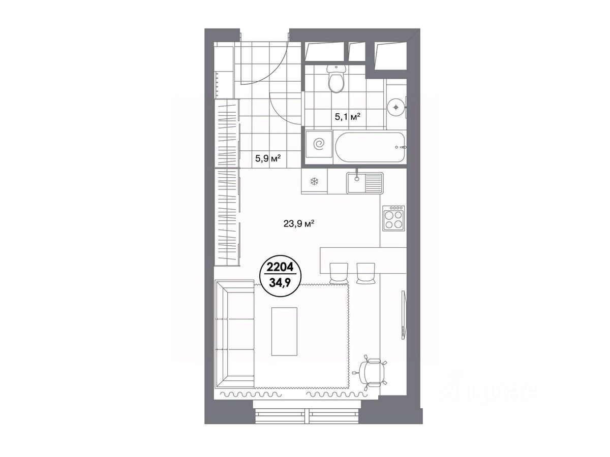 В премиальном квартале "Матч Поинт" представлены апартаменты-студия 34,9 м² на 9 этаже.