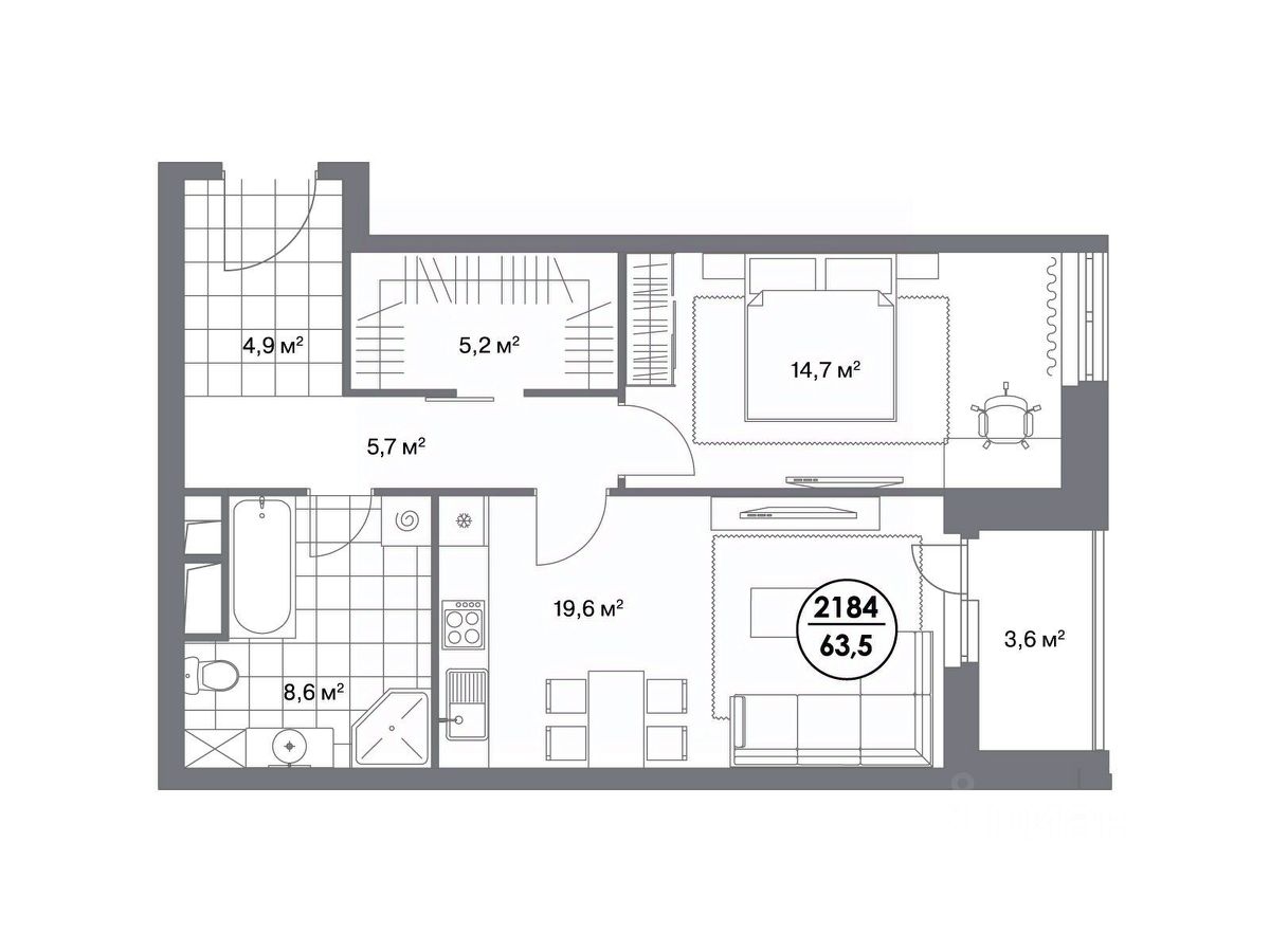 В премиальном квартале "Матч Поинт" представлены двухкомнатные апартаменты 63,5 м² на 9 этаже.