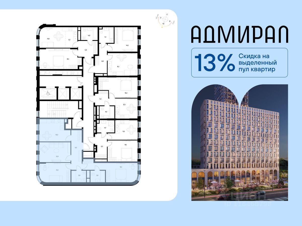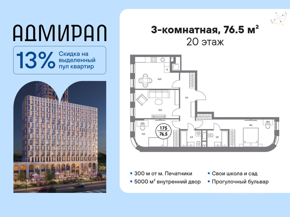 Архитектура корпусов отличается динамичностью облика благодаря переменной этажности: высокие башни сочетаются с домами средней этажности. Изящным украшением становятся арочные витражи. Интеллигентный и современный стиль "Адмирала" продолжается в гранд-лобби: пастельные оттенки интерьера и фактурные элементы декора создают атмосферу безмятежного отдыха, особое ощущение простора дарят высокие потолки до 4 м и витражные окна. В домах предусмотрено от трех до шести скоростных лифтов, каждый из них спускается на любой этаж подземного паркинга и обладает удобными сенсорными панелями управления и низким уровнем шума.