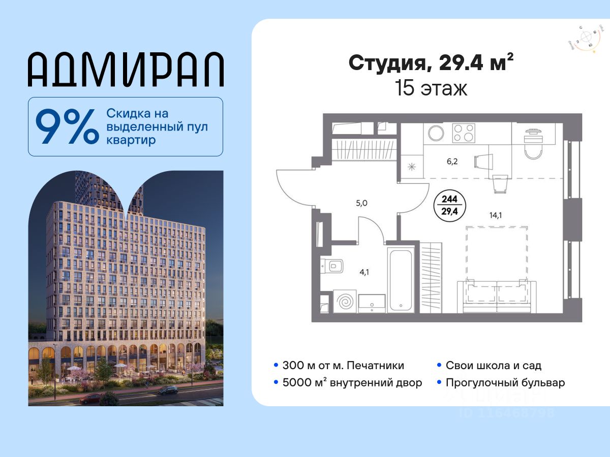 В динамично развивающемся районе Москвы, всего в 300 метрах от метро и в пешей близости от нового городского порта с протяженной набережной 13 км, свободной от автомобилей, продается студия площадью 29.40 м². без отделки.