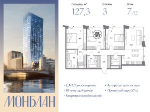 В элитном жилом комплексе "Монблан" на Шлюзовой набережной в Замоскворечье напрямую от девелопера ГК "Галс-Девелопмент" представлена 3-комнатная квартира квартира на 7 этаже общей площадью 127.30 м².