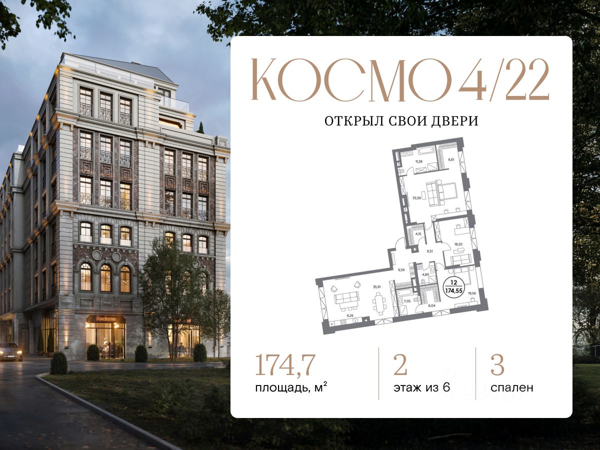 В клубном доме класса De Luxe "Космо 4/22", расположенном на острове Балчуг, напрямую от девелопера ГК "Галс-Девелопмент" представлена 3-комнатная квартира на 2 этаже общей площадью 174.70 м².