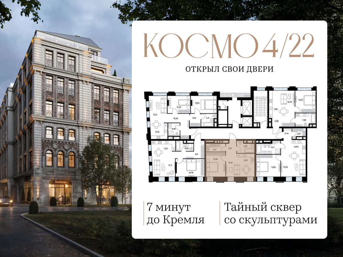 "Космо 4/22" находится всего в 7 минутах от Кремля с быстрым выездом на Садовое кольцо.