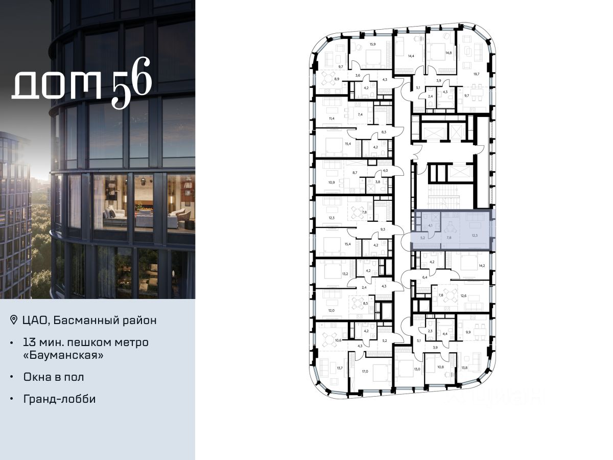 В премиум-квартале "Дом 56" на Бауманской напрямую от девелопера ГК "Галс-Девелопмент" представлена студия на 23 этаже общей площадью 29.40 м².