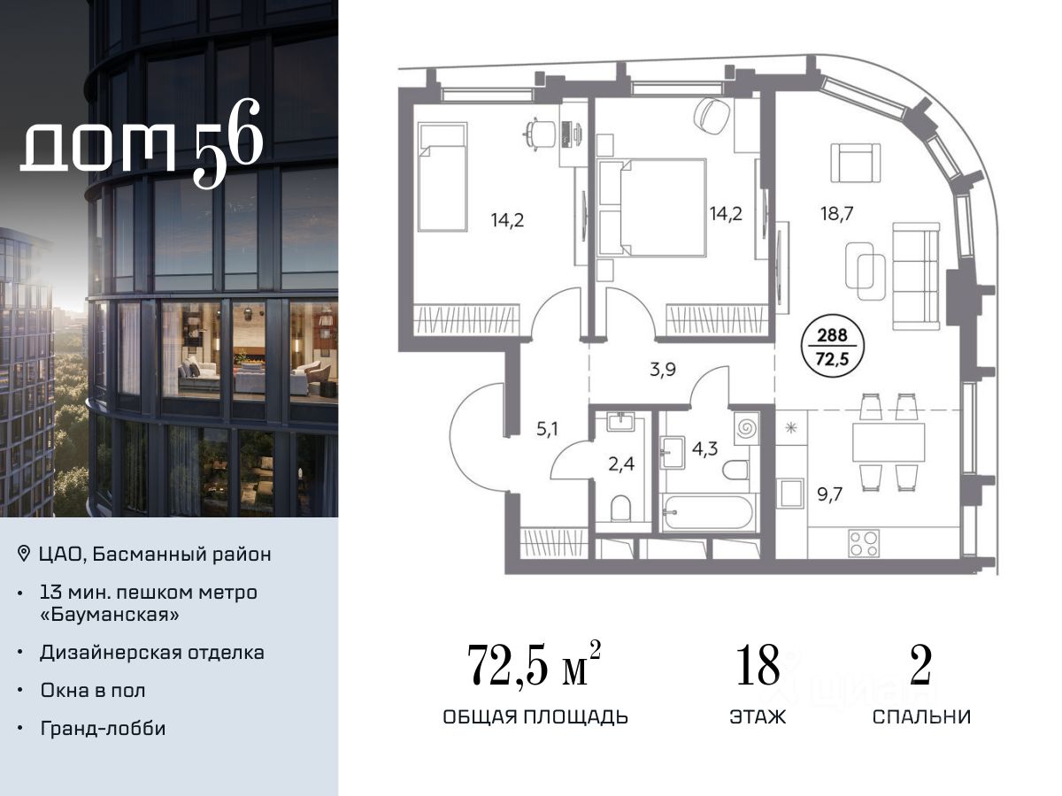 В премиум-квартале "Дом 56" на Бауманской напрямую от девелопера ГК "Галс-Девелопмент" представлена 2-комнатная квартира на 18 этаже общей площадью 72.50 м².
