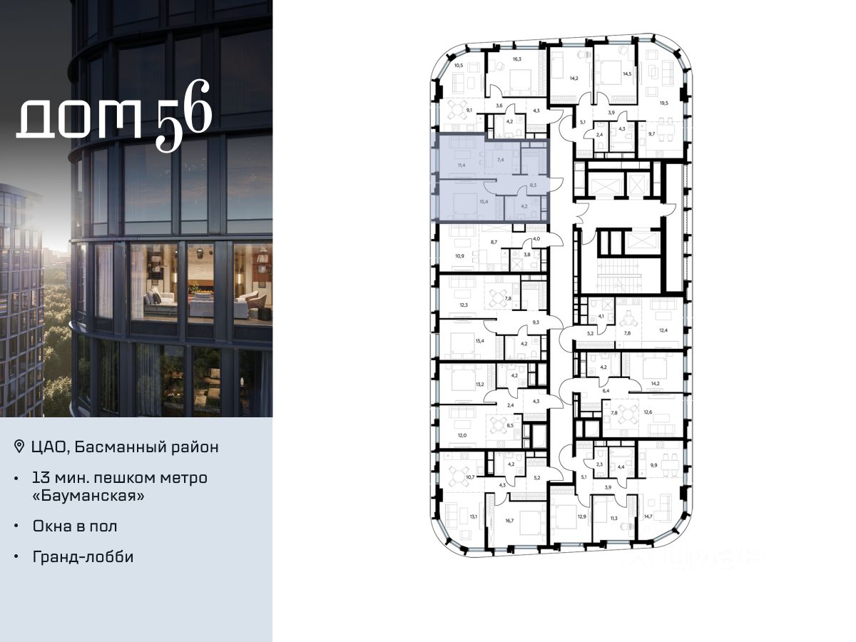 "Дом 56" - расположен в Басманном районе на ул. Фридриха Энгельса, всего в 12-15 минутах пешком от станций метро "Бауманская" и "Электрозаводская".