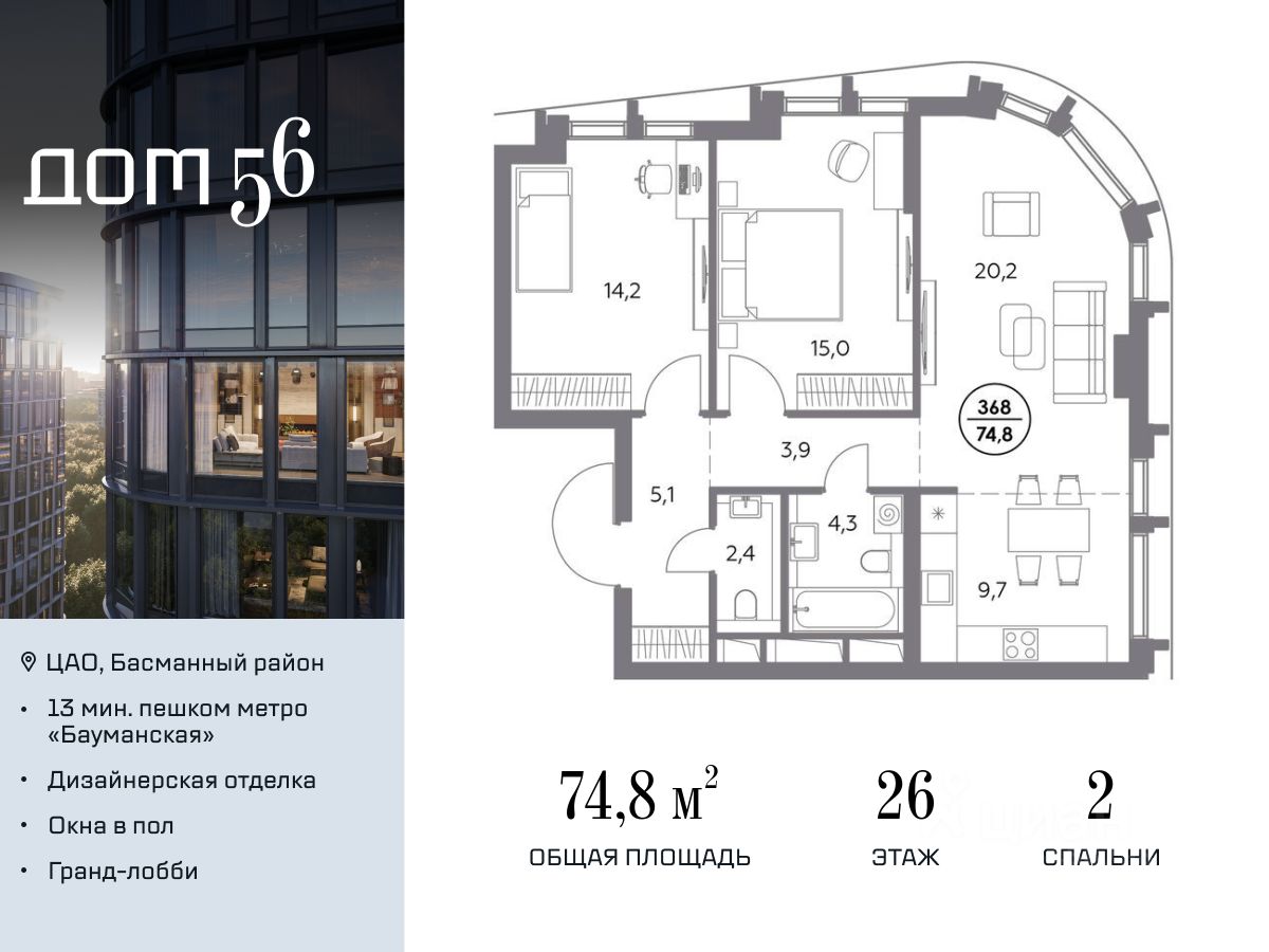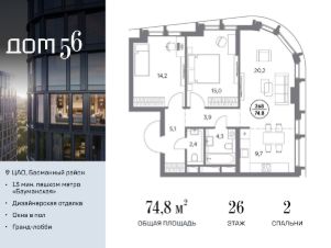 В премиум-квартале "Дом 56" на Бауманской напрямую от девелопера ГК "Галс-Девелопмент" представлена 2-комнатная квартира на 26 этаже общей площадью 74.80 м².