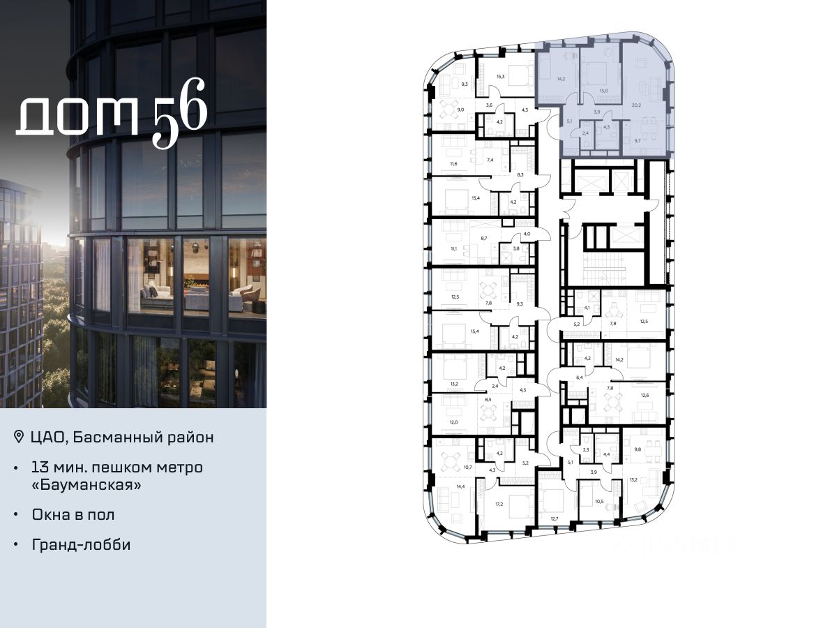 "Дом 56" - расположен в Басманном районе на ул. Фридриха Энгельса, всего в 12-15 минутах пешком от станций метро "Бауманская" и "Электрозаводская".