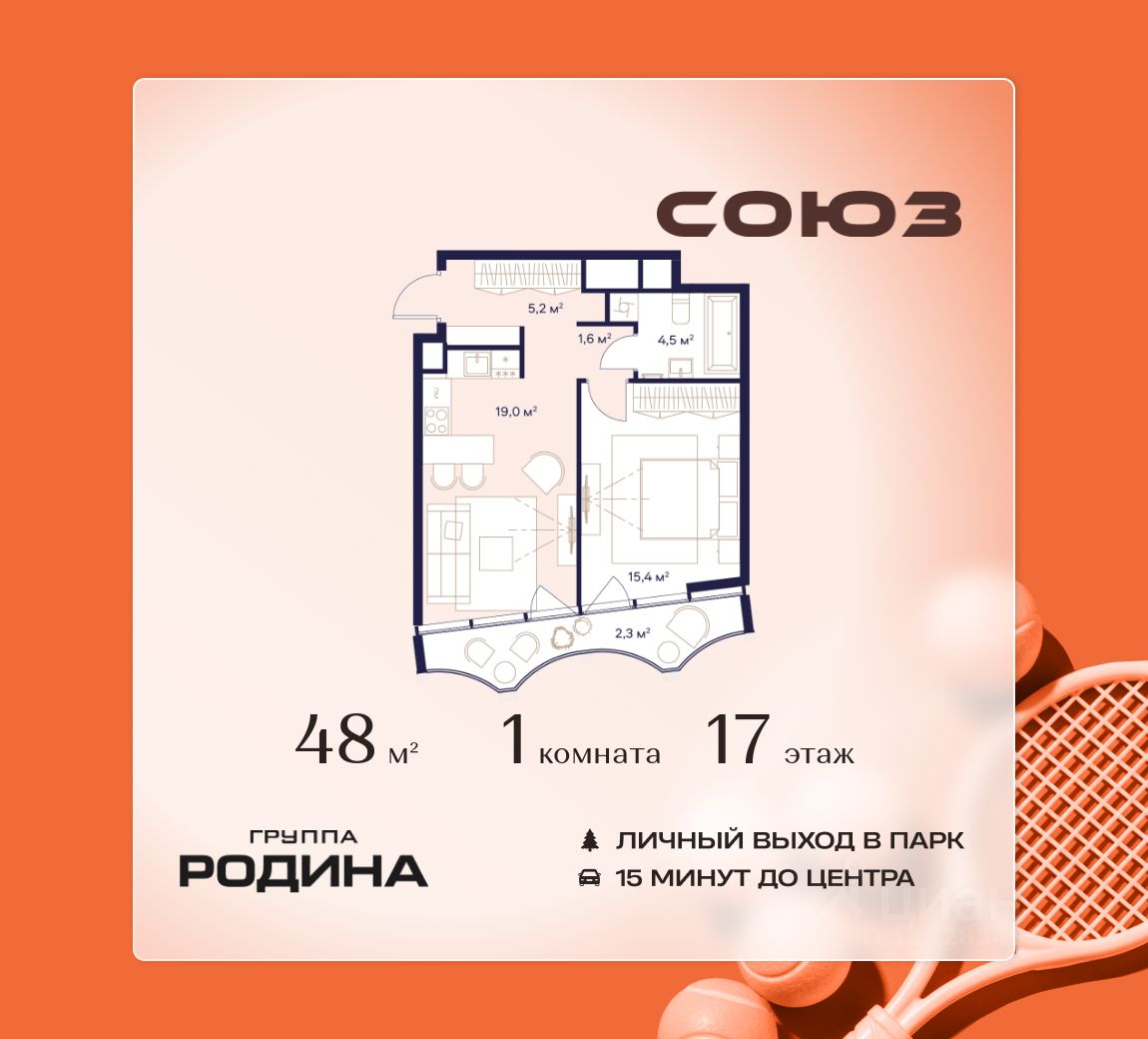Продаётся 1-комнатная квартира площадью 48 м² на 17 этаже в Жилом Комплексе "Союз".