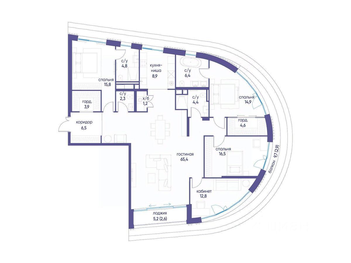 , 4 санузла: 1 раздельный и 3 совмещенных. В жилой зоне 2 больших окна на одну сторону, хорошая инсоляция.