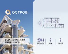 Продаётся квартира от застройщика: общая площадь 260.40 м², жилая 84.00 м², кухня 83.30 м², 2-й этаж, жилой квартал "Остров 10", (секция 1). Срок сдачи: 2 квартал 2026 года.
