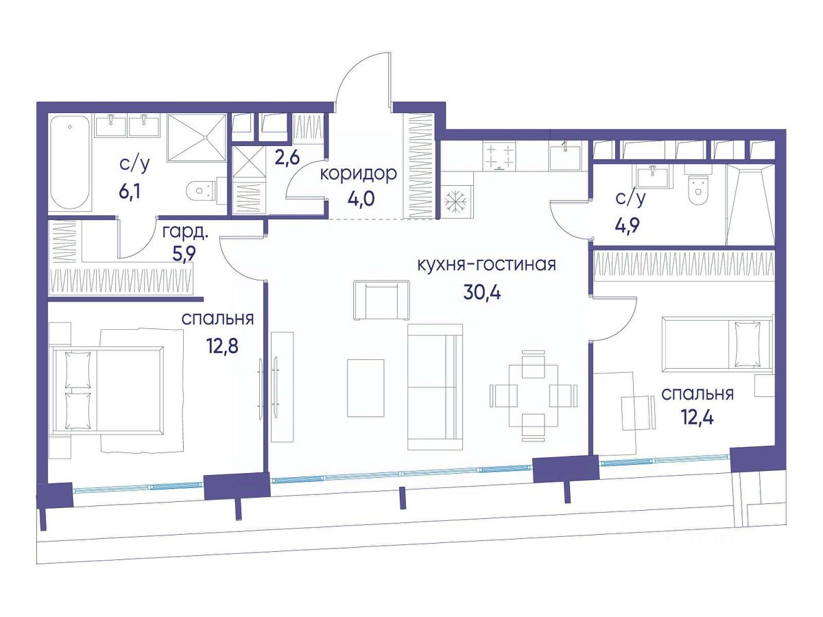 Продаётся двухкомнатная квартира от застройщика: общая площадь 79.10 м², жилая 25.20 м², кухня 30.40 м², 4, жилой квартал "Остров 7", корпус 3 (7 квартал) (секция 1). срок сдачи: 4-кв. 2025.