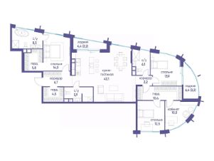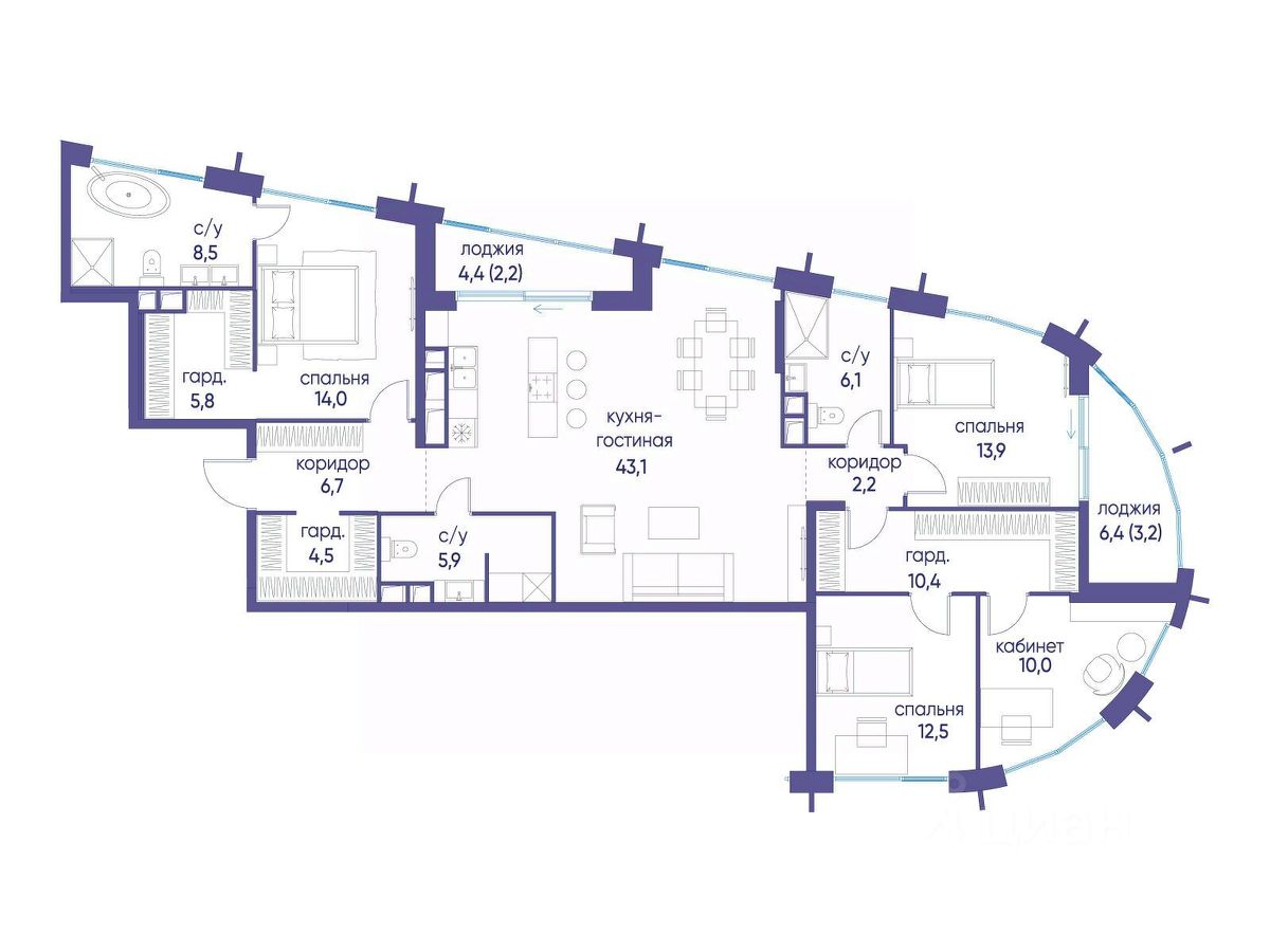 Продаётся четырехкомнатная квартира от застройщика: общая площадь 148.70 м², жилая 50.40 м², кухня 43.10 м², 14, жилой квартал "Остров 7", корпус 3 (7 квартал) (секция 1). срок сдачи: 4-кв. 2025.