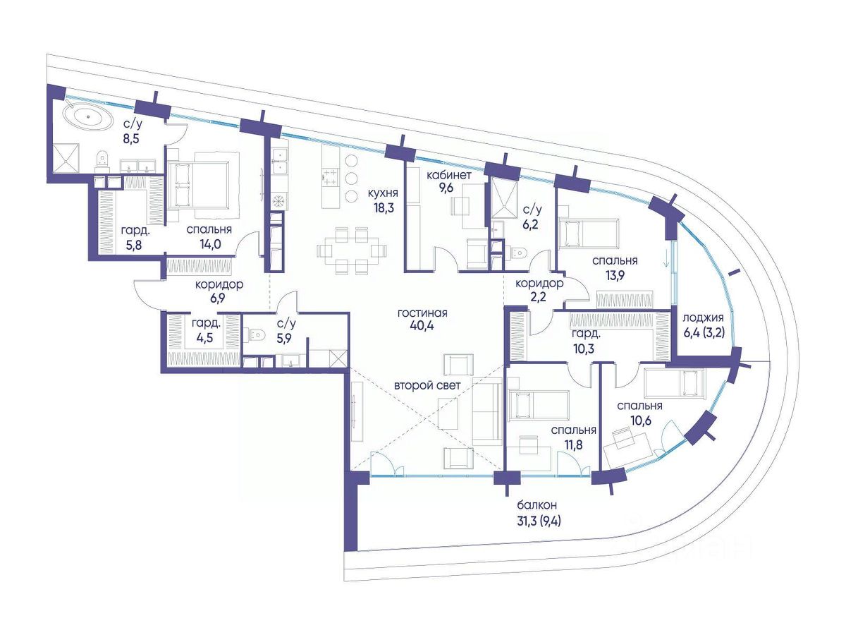 Продаётся многокомнатная квартира от застройщика: общая площадь 180.80 м², жилая 59.90 м², кухня 58.70 м², 17, жилой квартал "Остров 7", корпус 5 (7 квартал) (секция 1). срок сдачи: 4-кв. 2025.